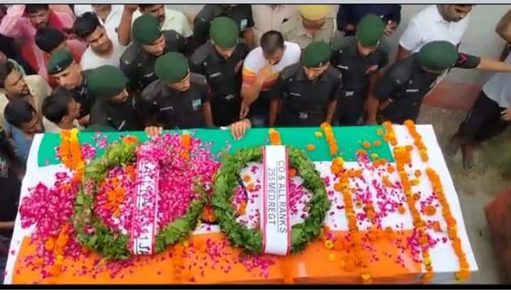 परसपुर गोंडा : परसपुर थाना क्षेत्र के परसपुर ग्रामीण गंगा पुरवा गांव निवासी सेना के जवान महेश प्रताप सिंह के पार्थिव शरीर के अंतिम संस्कार में जनमानस की आंखे नम हो गई लोगों ने विनम्र श्रद्धांजलि अर्पित करते हुए अंतिम संस्कार में शामिल हुए । बताया जा रहा है कि अवकाश पर अपने घर आ रहे सेना के जवान महेश प्रताप सिंह की करनैलगंज रेलवे स्टेशन के समीप ट्रेन की चपेट मे आकर गत शुक्रवार की सुबह मौत हो गई इसकी सूचना मिलते ही परिजनों में मातम छा गया ।और क्षेत्र में शोक की लहर दौड़ गई परिजनों के अनुसार भोपाल में तैनात रहे सैनिक महेश प्रताप सिंह अवकाश पर ट्रेन से अपने घर आ रहे थे ।शुक्रवार की सुबह करनैलगंज रेलवे स्टेशन के समीप ट्रेन की चपेट मे आकर उनकी मौत हो गई ।सूचना पर पहुंची जीआरपी पुलिस ने शव को कब्जे में लेकर जिला मुख्यालय पोस्टमार्टम के लिए भेज दिया । शनिवार की सुबह सैनिक डोगरा रेजीमेंट फैजाबाद से आए हुए जवानों ने श्रद्धांजलि दी सैनिक महेश प्रताप सिंह के पार्थिव शरीर को अंतिम संस्कार के लिए ले जाया गया । उसकी बहन पूनम ने बताया कि दिवंगत सैनिक महेश प्रताप सिंह अपने छह भाई राजकुमार सिंह ,अनुज सिंह , सत्रोहन सिंह ,माता प्रसाद सिंह ,विक्रम सिंह से छोटा भाई था पार्वती सिंह ,पूनम सिंह व ममता सिंह तीन बहने है सैनिक महेश प्रताप सिंह का विवाह वर्ष 2019 में कंडरू गांव से सत्यम सिंह से हुआ था विवाह बाद सैनिक महेश प्रताप सिंह के दाम्पत्य जीवन में एक वर्ष का देवांश सिंह नामक लड़का है महेश मीडियम रेजीमेंट के 255 बटालियन में लांसनायक पद पर कार्यरत थे इनकी तैनाती गलवान घाटी में थी ।सैनिक प्रशिक्षण काल में ही सैनिक महेश प्रताप सिंह के सिर से पिता बासदेव सिंह का साया उठ गया शुक्रवार को दोपहर बाद पोस्टमार्टम उपरांत सैनिक महेश प्रताप सिंह का शव पैतृक गांव पहुंचते ही कोहराम मच गया जवान के अंतिम यात्रा में सेना की बटालियन व आसपास गांव के काफी संख्या में नागरिक शामिल रहे हैं लोगों ने नम आंखों से सेना के जवान की अंतिम विदाई दी ।