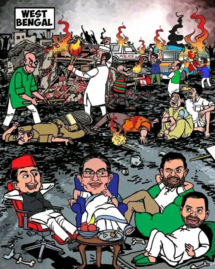 आज देश का दुर्भाग्य है कि पश्चिम बंगाल में ममता बनर्जी का शासन है और आज तक उन्होंने वोट बैंक की राजनीति में एक विशेष समुदाय को विशेष दर्जा मानो प्रदान किया है,,, जब मन हो हिन्दू धर्म,हिंदुओं की आस्था एवम् हत्याएं कर दी जा रही हैं और ममता जी मौन ही हैं अतः जो राजा अपनी प्रजा की रक्षा नहीं कर सकता है उसे राजा होने का कोई अधिकार नहीं है