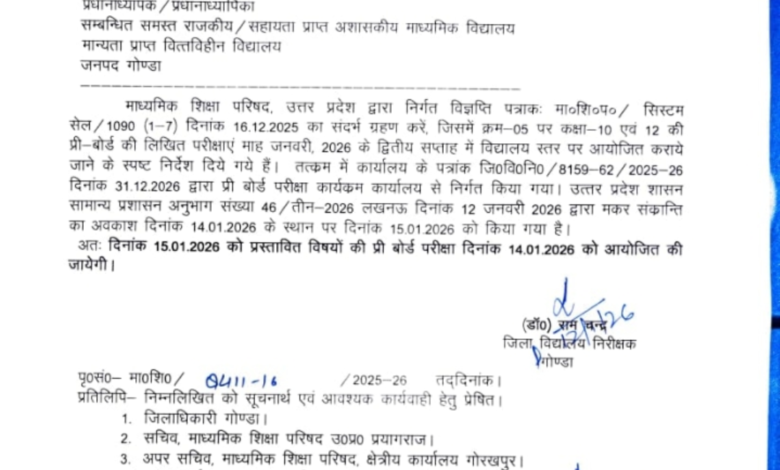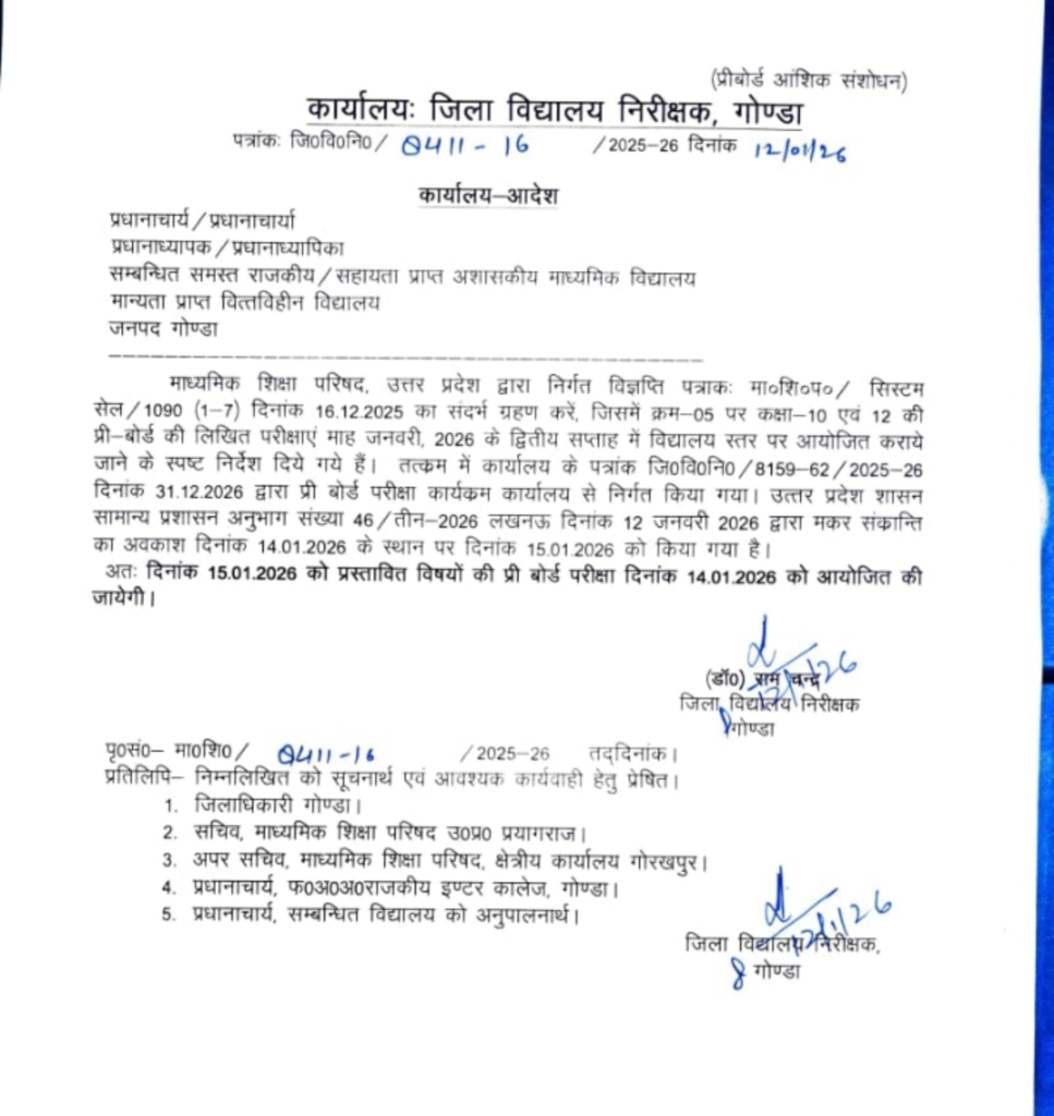 गोण्डा। माध्यमिक शिक्षा परिषद, उत्तर प्रदेश के निर्देशों के क्रम में कक्षा 10 एवं 12 की प्री-बोर्ड परीक्षाओं को लेकर जिला विद्यालय निरीक्षक कार्यालय गोण्डा द्वारा आंशिक संशोधन का आदेश जारी किया गया है। जनपद में हाईस्कूल एवं इंटरमीडिएट की प्री-बोर्ड परीक्षाएं 12 जनवरी से विद्यालय स्तर पर प्रारम्भ हो चुकी हैं। इसी बीच मकर संक्रांति पर्व के अवकाश में परिवर्तन होने के कारण परीक्षा तिथियों में आंशिक बदलाव किया गया है। जिला विद्यालय निरीक्षक गोण्डा द्वारा जारी आदेश के अनुसार उत्तर प्रदेश शासन के सामान्य प्रशासन अनुभाग द्वारा मकर संक्रांति का अवकाश अब 14 जनवरी के स्थान पर 15 जनवरी घोषित किया गया है। अवकाश परिवर्तन को दृष्टिगत रखते हुए यह निर्णय लिया गया है कि 15 जनवरी को प्रस्तावित प्री-बोर्ड परीक्षा अब 14 जनवरी को आयोजित कराई जाएगी। यह संशोधन जनपद के समस्त राजकीय, सहायता प्राप्त अशासकीय, मान्यता प्राप्त एवं वित्तविहीन माध्यमिक विद्यालयों पर समान रूप से लागू होगा। जिला विद्यालय निरीक्षक ने सभी प्रधानाचार्यों एवं प्रधानाध्यापकों को निर्देशित किया है कि संशोधित तिथि के अनुसार प्री-बोर्ड परीक्षा का संचालन सुनिश्चित किया जाए, ताकि विद्यार्थियों को किसी प्रकार की असुविधा न हो और परीक्षा प्रक्रिया सुचारु रूप से संपन्न कराई जा सके।