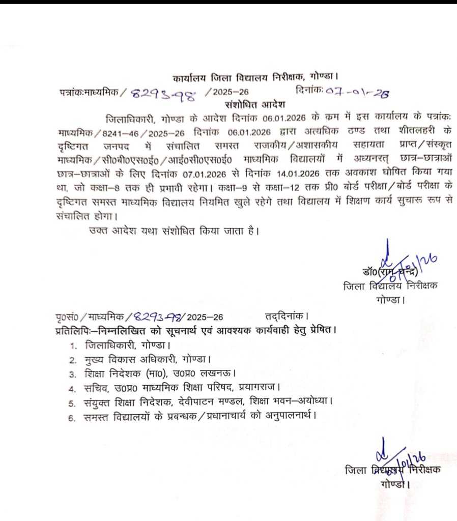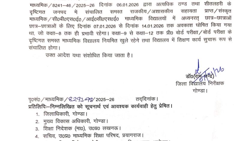 गोंडा : ठंड के चलते अवकाश आदेश में संशोधन, कक्षा आठ तक ही विद्यालय बंद, कक्षा 9 से 12 तक विद्यालय खुलने का आदेश हुआ जारी
