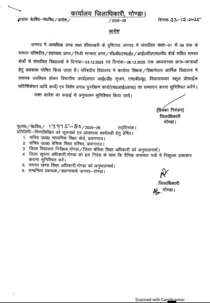 परसपुर (गोण्डा) : जिले में लगातार बढ़ रही शीतलहर और अत्यधिक ठंड को देखते हुए जिलाधिकारी गोंडा प्रियंका निरंजन ने कक्षा 1 से 8 तक के सभी विद्यालयों में अवकाश घोषित कर दिया है। जारी आदेश के अनुसार जनपद में संचालित परिषदीय, सहायता प्राप्त, निजी मान्यता प्राप्त, सीबीएसई एवं आईसीएसई बोर्ड सहित सभी बोर्डों के विद्यालयों में 24 दिसंबर से 26 दिसंबर तक विद्यार्थियों के लिए अवकाश रहेगा। हालांकि इस अवधि में शिक्षकों और शिक्षणेत्तर कर्मचारियों को विद्यालय में उपस्थित रहकर विभागीय कार्य करने होंगे। जिलाधिकारी ने स्पष्ट किया है कि इस दौरान अपार आईडी सृजन, एमबीयू, विद्यालयवार स्कूल प्रोफाइल सर्टिफिकेशन सहित विशेष प्रगाढ़ पुनरीक्षण (एसआईआर) से जुड़े कार्य पूर्ववत चलते रहेंगे। आदेश का कड़ाई से अनुपालन सुनिश्चित करने के निर्देश दिए गए हैं।
