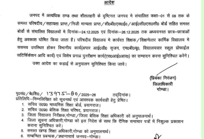 परसपुर (गोण्डा) : जिले में लगातार बढ़ रही शीतलहर और अत्यधिक ठंड को देखते हुए जिलाधिकारी गोंडा प्रियंका निरंजन ने कक्षा 1 से 8 तक के सभी विद्यालयों में अवकाश घोषित कर दिया है। जारी आदेश के अनुसार जनपद में संचालित परिषदीय, सहायता प्राप्त, निजी मान्यता प्राप्त, सीबीएसई एवं आईसीएसई बोर्ड सहित सभी बोर्डों के विद्यालयों में 24 दिसंबर से 26 दिसंबर तक विद्यार्थियों के लिए अवकाश रहेगा। हालांकि इस अवधि में शिक्षकों और शिक्षणेत्तर कर्मचारियों को विद्यालय में उपस्थित रहकर विभागीय कार्य करने होंगे। जिलाधिकारी ने स्पष्ट किया है कि इस दौरान अपार आईडी सृजन, एमबीयू, विद्यालयवार स्कूल प्रोफाइल सर्टिफिकेशन सहित विशेष प्रगाढ़ पुनरीक्षण (एसआईआर) से जुड़े कार्य पूर्ववत चलते रहेंगे। आदेश का कड़ाई से अनुपालन सुनिश्चित करने के निर्देश दिए गए हैं।