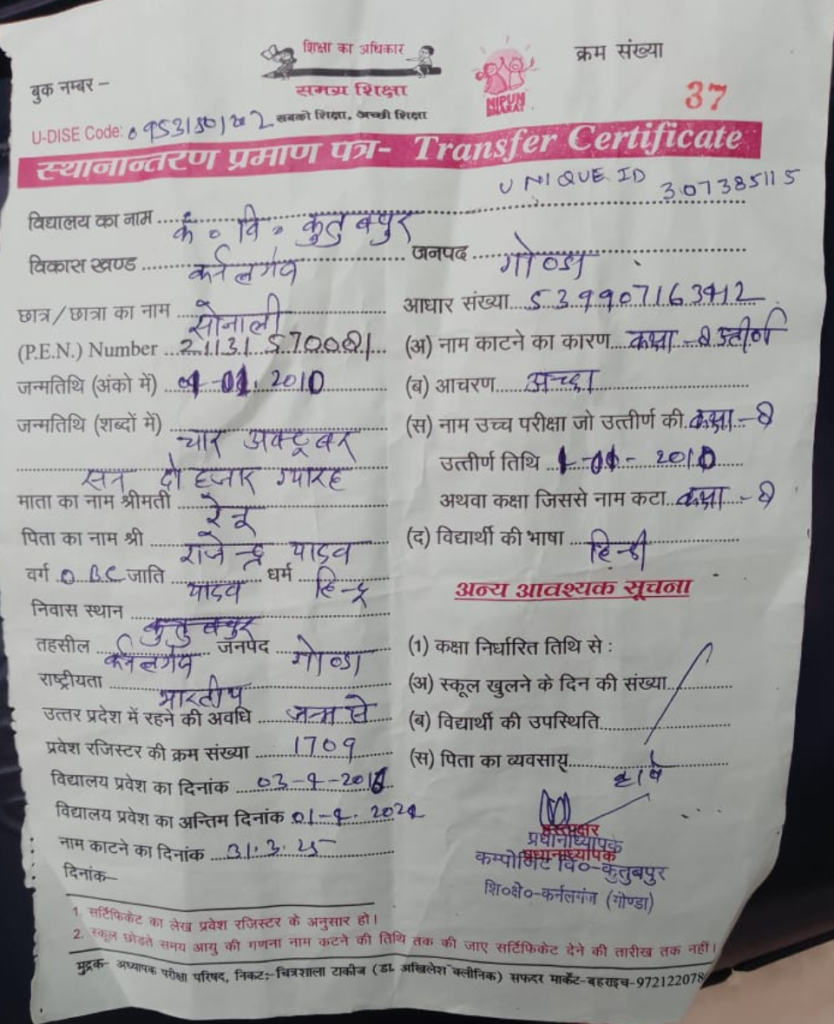कर्नलगंज (गोंडा)। कर्नलगंज विकासखंड के कम्पोजिट विद्यालय कुतुबपुर से चौंकाने वाला मामला सामने आया है, जहां एक ही छात्रा के नाम और जन्मतिथि को लेकर रिकॉर्ड में गंभीर अनियमितता पाई गई है। शैक्षिक दस्तावेजों, समग्र शिक्षा पोर्टल, आधार कार्ड और ट्रांसफर सर्टिफिकेट के विवरणों की जांच में यह खुलासा हुआ है कि छात्रा के नाम दो अलग-अलग रूप में दर्ज हैं। विद्यालय द्वारा जारी स्थानांतरण प्रमाण पत्र में छात्रा का नाम सोनाली लिखा गया है जबकि समग्र शिक्षा पोर्टल और आधार कार्ड में उसी छात्रा का नाम शिवानी दर्ज है। नाम के साथ-साथ जन्मतिथि को लेकर भी भारी गड़बड़ी उजागर हुई है। टीसी में अंकों में जन्मतिथि 04-01-2010 और शब्दों में चार अक्टूबर 2011 दर्ज है जबकि आधार कार्ड और स्कूल रजिस्टर में जन्मतिथि 01/01/2010 अंकित है। सबसे चौंकाने वाली बात यह है कि स्थानांतरण प्रमाण पत्र में यह उल्लेख है कि छात्रा ने वर्ष 2010 में कक्षा 8 उत्तीर्ण कर ली जबकि उसी वर्ष या अगले वर्ष ही उसका जन्म हुआ दर्शाया गया है। यानी दस्तावेजों के अनुसार छात्रा ने जन्म से पहले ही आठवीं कक्षा पास कर ली। हालांकि छात्रा के माता-पिता के नाम—माता रेनू व पिता राजेन्द्र यादव—सभी दस्तावेजों में समान हैं, जिससे यह स्पष्ट होता है कि नाम और जन्मतिथि में किया गया फेरबदल जानबूझकर किया गया है।