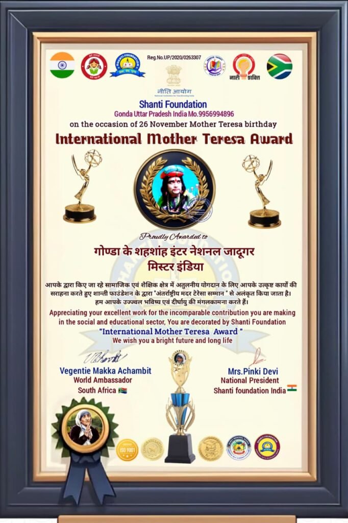 कार्यक्रम के दौरान शांति फाउंडेशन इंडिया की राष्ट्रीय अध्यक्ष मिसेज पिंकी देवी तथा वर्ल्ड एम्बेसडर साउथ अफ्रीका वेगेंटिए मक्का अचाम्बिट ने संयुक्त रूप से उन्हें यह अंतर्राष्ट्रीय सम्मान भेंट किया। संस्था की ओर से जारी संदेश में कहा गया कि जनकल्याण के प्रति आपकी निष्ठा, सेवा भावना और निरंतर सामाजिक सक्रियता को मान्यता देते हुए आपको इंटरनेशनल मदर टेरेसा अवार्ड प्रदान किया जा रहा है। हम आपके उज्ज्वल भविष्य और दीर्घायु की हार्दिक शुभकामनाएं देते हैं। उल्लेखनीय है कि जादूगर मिस्टर इंडिया की प्रस्तुतियाँ केवल मनोरंजन तक सीमित नहीं हैं, बल्कि वे अपनी जादुई कला के माध्यम से नशा मुक्ति, बाल अधिकार, महिला सशक्तिकरण, पर्यावरण संरक्षण और राष्ट्रप्रेम जैसे विषयों पर जनजागृति फैलाते हैं। यह उपलब्धि न केवल शहंशाह इंटरनेशनल जादूगर के लिए व्यक्तिगत सम्मान का विषय है, बल्कि जनपद गोण्डा के लिए भी अत्यंत गौरव का क्षण है, जिसने जिले को अंतरराष्ट्रीय मंच पर विशेष पहचान दिलाई है।