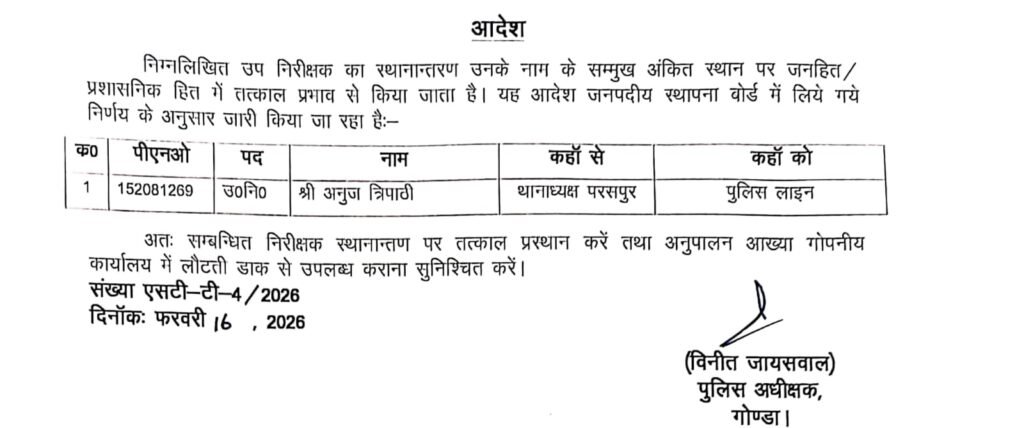 परसपुर ( गोंडा ) : जनपद गोण्डा के पुलिस अधीक्षक विनीत जायसवाल ने देर रात्रि परसपुर थानाध्यक्ष अनुज त्रिपाठी को तत्काल प्रभाव से लाइन हाजिर कर दिया है। वहीं उपनिरीक्षक कमल शंकर चतुर्वेदी को थाना कोतवाली देहात गोंडा से स्थानांतरित कर थाना परसपुर का नया थानाध्यक्ष नियुक्त किया गया है।