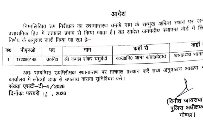 परसपुर ( गोंडा ) : जनपद गोण्डा के पुलिस अधीक्षक विनीत जायसवाल ने देर रात्रि परसपुर थानाध्यक्ष अनुज त्रिपाठी को तत्काल प्रभाव से लाइन हाजिर कर दिया है। वहीं उपनिरीक्षक कमल शंकर चतुर्वेदी को थाना कोतवाली देहात गोंडा से स्थानांतरित कर थाना परसपुर का नया थानाध्यक्ष नियुक्त किया गया है।