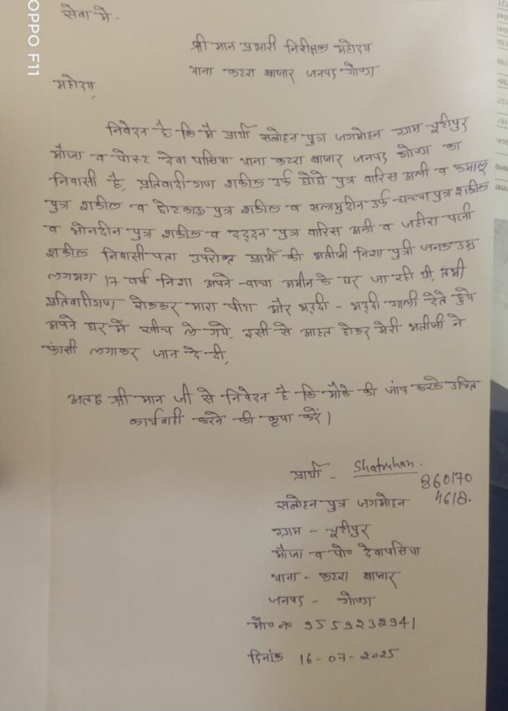 कटरा बाजार, गोंडा : थाना कटरा बाजार क्षेत्र के देवापसिया चूटीपुर गांव में बुधवार को एक 17 वर्षीय किशोरी द्वारा फांसी लगाकर आत्महत्या कर लेने की दर्दनाक घटना ने पूरे गांव को झकझोर कर रख दिया। इस घटना के बाद परिजनों और ग्रामीणों में भारी आक्रोश देखने को मिला। परिजनों का आरोप है कि अगर पुलिस ने समय रहते छेड़छाड़ और मारपीट के मामले में कार्रवाई की होती, तो किशोरी की जान बच सकती थी। पीड़ित पिता ने बताया कि तीन दिन पूर्व गांव के ही कुछ दबंग युवकों ने उनकी बेटी के साथ खेत में मारपीट कर जबरन अश्लील हरकतें की थीं। घटना की तहरीर थाने में दी गई थी लेकिन पुलिस ने रिपोर्ट लिखने के बजाय टालमटोल किया। उन्होंने कई बार गुहार लगाई, लेकिन पुलिसकर्मियों ने सिर्फ आश्वासन दिया। इस घटना के बाद किशोरी बुरी तरह डर गई थी और घर से बाहर निकलने में भी घबराती थी।