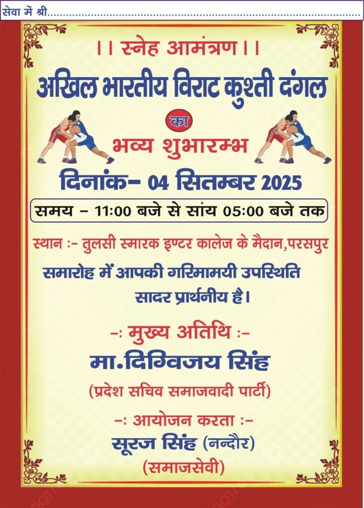 परसपुर (गोंडा ) : आज दिनांक 04 सितम्बर 2025, गुरुवार को परसपुर क्षेत्र एक ऐतिहासिक खेल आयोजन का साक्षी बनने जा रहा है। क्षेत्र के प्रतिष्ठित तुलसी स्मारक इंटर कॉलेज परसपुर के विशाल मैदान में अखिल भारतीय विराट कुश्ती दंगल का भव्य आयोजन होने जा रहा है जो प्रातः 11:00 बजे से सायं 05:00 बजे तक चलेगा। आयोजन में उत्तर प्रदेश के विभिन्न जनपदों के साथ-साथ अन्य राज्यों और विदेशों से आए नामी-गिरामी पहलवान अपनी कुश्ती कला का प्रदर्शन करेंगे। कार्यक्रम के मुख्य अतिथि समाजवादी पार्टी के प्रदेश सचिव मा. दिग्विजय सिंह होंगे जिनकी उपस्थिति से कार्यक्रम की गरिमा और अधिक बढ़ेगी। इस विराट दंगल का आयोजन समाजसेवी सूरज सिंह (नन्दौर) के संयोजन में किया जा रहा है जिन्होंने परंपरागत खेलों के संरक्षण और ग्रामीण युवाओं को खेलों की मुख्यधारा से जोड़ने के उद्देश्य से यह पहल की है। आयोजन समिति का कहना है कि इस दंगल से क्षेत्रीय प्रतिभाओं को एक बेहतर मंच मिलेगा और खेल संस्कृति को नई दिशा मिलेगी। कार्यक्रम को लेकर खेल प्रेमियों में भारी उत्साह देखा जा रहा है और बड़ी संख्या में लोगों के जुटने की उम्मीद है।