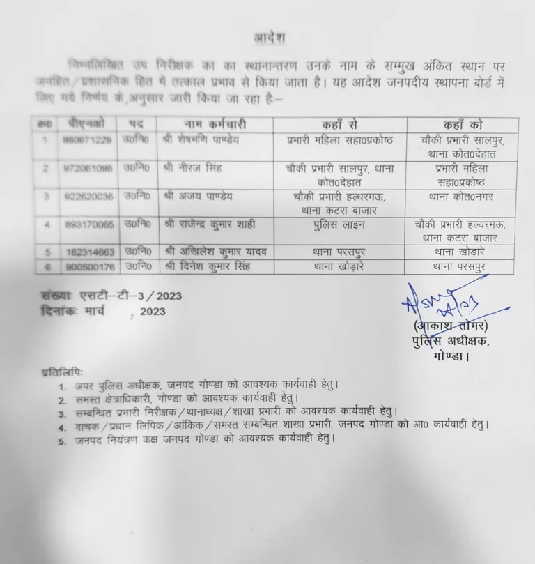 गोंडा: जनपद गोंडा के पुलिस अधीक्षक आकाश तोमर ने प्रशासनिक व्यवस्था को देखते हुए आधा दर्जन उप निरीक्षकों का किया तबादला । पिछले दिनों कई समाचार पत्रों में प्रकाशित हुए कुछ मठाधीश का आखिर फेरबदल कब होगा ।