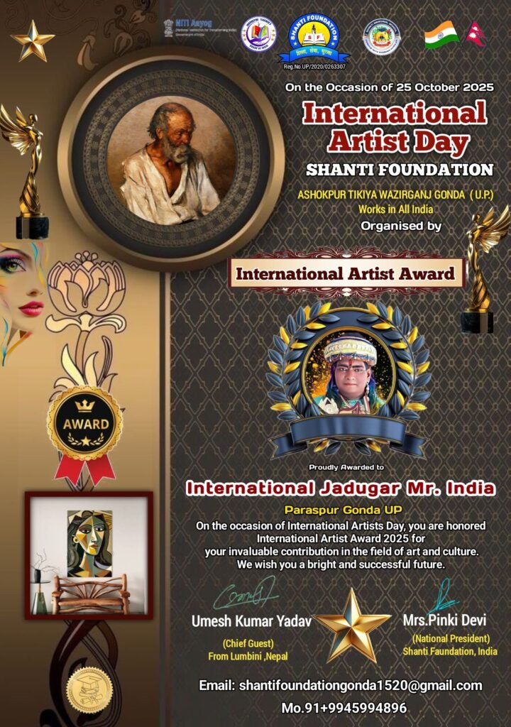 परसपुर ( गोंडा ) : गोण्डा के अशोकपुर टिकिया वजीरगंज स्थित शांति फाउंडेशन द्वारा शांति फाउंडेशन इंडिया की राष्ट्रीय अध्यक्ष पिंकी देवी की अध्यक्षता में अंतरराष्ट्रीय कलाकार दिवस के अवसर पर एक भव्य सम्मान समारोह का आयोजन किया गया। इस अवसर पर कला और संस्कृति के क्षेत्र में उत्कृष्ट योगदान हेतु ग्राम हरदिहा सीर पुरवा निवासी इंटरनेशनल जादूगर मिस्टर इंडिया उर्फ रऊफ खान को “इंटरनेशनल आर्टिस्ट अवॉर्ड 2025” से सम्मानित किया गया। समारोह में मुख्य अतिथि के रूप में लुंबिनी (नेपाल) से पधारे उमेश कुमार यादव उपस्थित रहे, जिन्होंने सम्मान प्रदान किया। कार्यक्रम के दौरान संस्था की अध्यक्ष पिंकी देवी ने कहा कि शांति फाउंडेशन पूरे भारत में कला, संस्कृति और समाजसेवा के क्षेत्र में कार्यरत है, और ऐसे आयोजनों से कलाकारों को नई ऊर्जा व प्रेरणा मिलती है। इस अवसर पर सम्मानित हुए इंटरनेशनल जादूगर मिस्टर इंडिया ने कहा कि यह सम्मान उनके लिए गर्व और प्रेरणा का क्षण है तथा वे आगे भी भारतीय कला और संस्कृति को अंतरराष्ट्रीय स्तर पर नई पहचान दिलाने का प्रयास जारी रखेंगे। कार्यक्रम के समापन पर संस्था की ओर से सभी अतिथियों और प्रतिभागियों का आभार व्यक्त किया गया।