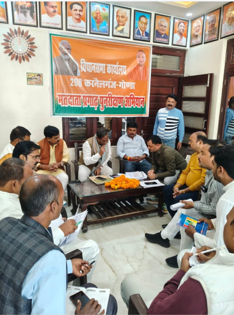 परसपुर ( गोंडा ) : नगर पंचायत परसपुर स्थित विधायक अजय सिंह के जनसहयोग केंद्र पर सोमवार को मतदाता प्रगाढ़ पुनरीक्षण अभियान को लेकर एक महत्वपूर्ण बैठक आयोजित की गई। बैठक का संचालन विधानसभा कर्नलगंज के विधायक प्रतिनिधि सूरज सिंह ने किया, जबकि अध्यक्षता अवध क्षेत्र के क्षेत्रीय उपाध्यक्ष अमित गुप्ता ने की। क्षेत्रीय उपाध्यक्ष ने कार्यकर्ताओं से बूथ स्तर पर सक्रिय रहकर अधिक से अधिक लोगों को मतदाता सूची में जोड़ने का आह्वान किया। वक्ताओं ने अपने विचार रखते हुए अभियान को सफल बनाने का संकल्प व्यक्त किया। स्थानीय पदाधिकारी, कार्यकर्ता और क्षेत्रवासी बड़ी संख्या में शामिल हुए और सभी ने मिलकर मतदाता प्रगाढ़ पुनरीक्षण अभियान को सफल बनाने की संयुक्त प्रतिबद्धता जताई। बैठक में अभियान की रूपरेखा, मतदाता सूची के पुनरीक्षण तथा नए पात्र मतदाताओं को शामिल करने की प्रक्रिया पर विस्तारपूर्वक चर्चा की गई।
