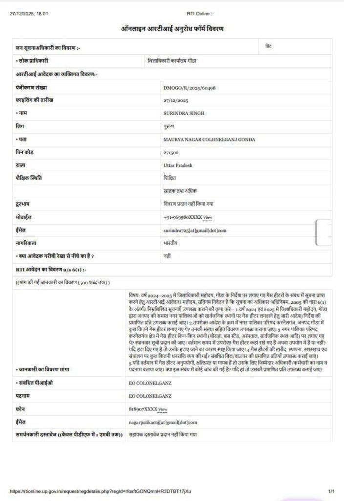 गोंडा। जनपद में ठंड से बचाव और प्रदूषण नियंत्रण के उद्देश्य से नगर क्षेत्रों के सार्वजनिक स्थलों पर लगाए गए गैस हीटर अब सवालों के घेरे में आ गए हैं। तत्कालीन जिलाधिकारी नेहा शर्मा के निर्देश पर वर्ष 2024–2025 में शुरू की गई इस योजना के तहत लगाए गए गैस हीटरों की वर्तमान स्थिति स्पष्ट न होने पर नगर पालिका परिषद कर्नलगंज के एक नागरिक ने सूचना का अधिकार अधिनियम के तहत आरटीआई आवेदन दाखिल कर प्रशासन से जवाबदेही मांगी है। मौर्य नगर, कर्नलगंज निवासी सुरेंद्र सिंह छाबड़ा द्वारा लोक सूचना अधिकारी/जिलाधिकारी कार्यालय गोंडा को भेजे गए आरटीआई आवेदन में पूछा गया है कि जिलाधिकारी के आदेश पर जनपद की विभिन्न नगर पालिकाओं व नगर पंचायतों में कुल कितने गैस हीटर खरीदे गए और उन्हें किन-किन सार्वजनिक स्थलों पर स्थापित किया गया। विशेष रूप से नगर पालिका परिषद कर्नलगंज में लगाए गए गैस हीटरों की संख्या और उनके वर्तमान स्थान की जानकारी मांगी गई है। आरटीआई में यह भी सवाल उठाया गया है कि वर्तमान समय में ये गैस हीटर कहां हैं—क्या वे अभी उपयोग में हैं या हटा दिए गए हैं। यदि हटा दिए गए हैं, तो उसके पीछे क्या कारण रहे। साथ ही हीटरों की खरीद, स्थापना, संचालन और रखरखाव पर कुल कितनी सरकारी धनराशि खर्च हुई, इससे संबंधित बिल-वाउचर और अभिलेख सार्वजनिक करने की मांग की गई है। आवेदन में यह भी स्पष्ट किया गया है कि यदि गैस हीटर अनुपयोगी, क्षतिग्रस्त या गायब हैं, तो इसके लिए कौन अधिकारी या कर्मचारी जिम्मेदार हैं तथा क्या अब तक इस संबंध में कोई जांच कराई गई है या नहीं। स्थानीय लोगों का कहना है कि ठंड के मौसम में सार्वजनिक स्थलों पर राहत देने के लिए लगाए गए गैस हीटर यदि वास्तव में खरीदे गए थे, तो आज वे नजर क्यों नहीं आ रहे। इससे सरकारी धन के दुरुपयोग, लापरवाही या संभावित गड़बड़ी की आशंका गहराती जा रही है। गौरतलब है कि जिले में अलाव जलाने से होने वाले प्रदूषण को कम करने और ठंड से राहत देने के उद्देश्य से पायलट प्रोजेक्ट के रूप में गैस हीटर लगाए गए थे। इन हीटरों में एलपीजी का उपयोग किया जाना था, ताकि धुएं से होने वाले प्रदूषण में कमी लाई जा सके। यह पहल तत्कालीन जिलाधिकारी नेहा शर्मा द्वारा की गई थी,जिसमें अधिकारियों को इनके संचालन और निगरानी के स्पष्ट निर्देश दिए गए थे। इस योजना के तहत गोंडा जिले की विभिन्न नगर पालिकाओं और नगर पंचायतों में कुल 27 स्थानों पर गैस हीटर लगाए गए थे। प्रत्येक नगर पंचायत में दो गैस हीटर लगाए जाने की व्यवस्था थी, जबकि नगर पालिका परिषद कर्नलगंज और मनकापुर में चार-चार, तथा नगर पालिका परिषद गोंडा में पांच गैस हीटर लगाए गए थे। प्रत्येक गैस हीटर की कीमत लगभग 12,500 रुपये बताई गई थी और एक रिफिलिंग लगभग 25 दिन तक चलने 