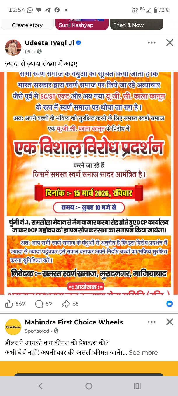 गाजियाबाद सिटी होटल अंबेडकर रोड पर सवर्ण महासभा के तत्वाधान में बैठक का आयोजन किया गया जिसमें यूजीसी के नए कानून को लेकर विरोध जताया. इस दौरान सवर्ण महासभा के प्रवक्ता बीके शर्मा हनुमान ने बताया कि जल्द ही एक महापंचायत का आयोजन किया जाएगा और एकत्र होकर जोरदार विरोध प्रदर्शन किया. जाएगा सवर्ण महासभा ने इसे काला कानून बताते हुए वापस लेने की मांग की और कहा कि यह कानून शिक्षा व्यवस्था को मजबूत करने के बजाय समाज को जाति और वर्ग के आधार पर विभाजित करने का काम करेगा. इससे सामाजिक समरसता और समान अवसर की भावना को गहरा आघात पहुंचेगा. यूजीसी को लेकर सवर्ण समाज वेंटिलेटर पर आ गया है, महासभा के संयोजक सेवाराम त्यागी, वीके अग्रवाल, विनय कक्कड़, विवेक तोमर, सुरेश शर्मा द्वारा संयुक्त निर्णय लिया गया कि अब की बार यूजीसी पर सवर्ण महासभा आर पार की लड़ाई लड़ेगा और गाजियाबाद में एक सवर्ण महासभा के तत्वाधान में विशाल महापंचायत का आयोजन किया जाएगा सरकार सवर्ण समाज की एकता की शक्ति को वह नहीं दबा सकती है। अब सवर्ण समाज अपने उपर हो रहे अन्याय व अत्याचार को बर्दाश्त नहीं करेगा क्योकि अब अन्याव व अत्याचार उनके बच्चों पर होने जा रहा है। केंद्र सरकार ने यूजीसी के माध्यम से सवर्ण समाज के बच्चों को शिक्षा के अधिकार से वंचित कर उनके बच्चों का भविष्य अंधकारमय बनाकर समाज को बर्बाद करने का षडयंत्र रचा है। कोर्ट के आदेश के बाद भी केंद्र सरकार द्वारा यूजीसी प्रावधानों को वापस ना लिया जाना इस बात का सबूत है कि केंद्र सरकार नहीं चाहती है कि सवर्ण समाज आगे बढे और समाज के बच्चे विकास करें। इसीलिए उसने सवर्ण समाज को बर्बाद करने के लिए यूजीसी को हथियार बनाया, मगर सवर्ण समाज अब चुप बैठने वाला नहीं है और अपनी एकजुटता के बल पर सरकार को इस षडयंत्र को वापस लेने या सत्ता से बाहर होने के लिए मजबूर कर देगा। इस अवसर पर स्वरूपचंद शर्मा,हरिओम त्यागी, उमेश गर्ग, नरेंद्र गुप्ता नंदी, राकेश गुप्ता, सतीश चोपड़ा, कुलदीप शर्मा, कल्याण देवत्यागी, प्रेमचंदत्यागी, धनप्रकाशत्यागी, अनिलत्यागी, सोमेंद्र त्यागी, हरिओम त्यागी, राकेश शर्मा सदरपुर, मनोजत्यागी, श्रद्धानंद त्यागी, देवेंद्र शर्मा, संजय चौहान, अशोक भारतीय, एनके गोयल आरके गोयल, बृजमोहन त्यागी, सुरेंद्र पाल त्यागी, एसके मिश्रा, डॉ एस के शर्मा विजयनगर, सुनील निगम, प्रभात त्यागी, सैकड़ो योद्धा उपस्थित थे