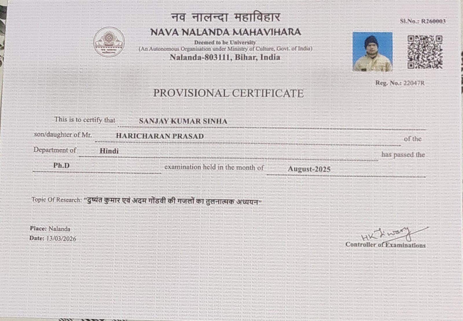 हिंदी ग़ज़ल के दो प्रमुख रचनाकार दुष्यंत कुमार और रामनाथ सिंह उर्फ अदम गोंडवी की ग़ज़लों पर किए गए संशोधनात्मक अध्ययन के लिए नव नालन्दा महाविहार के शोधार्थी संजय कुमार सिन्हा को 13 मार्च 2026 को पीएचडी की उपाधि प्रदान की गई। उनका शोध विषय “दुष्यंत कुमार एवं अदम गोंडवी की ग़ज़लों का तुलनात्मक अध्ययन” रहा। संजय कुमार सिन्हा ने अपना शोध कार्य डॉ. अनुराग शर्मा के निर्देशन में पूर्ण किया।