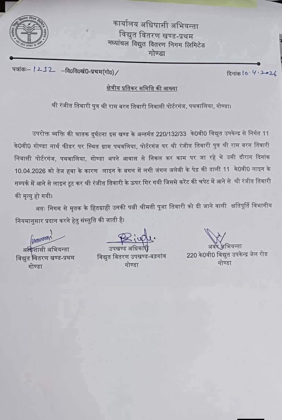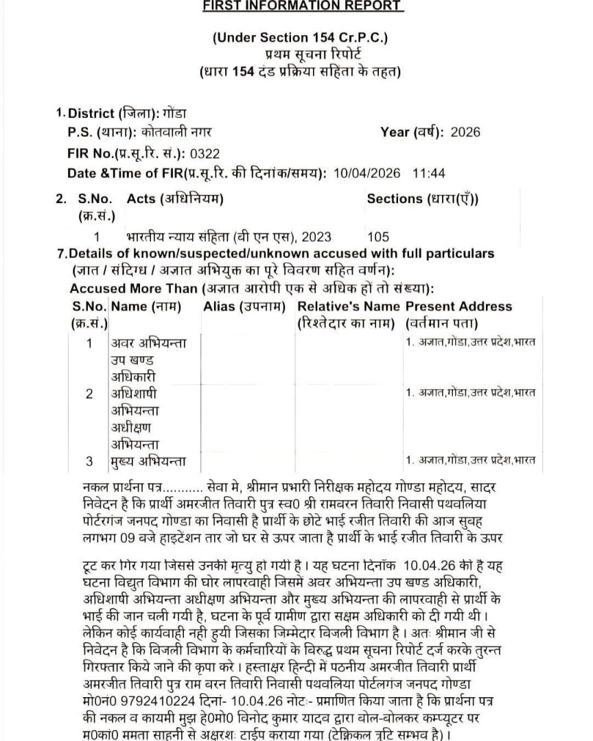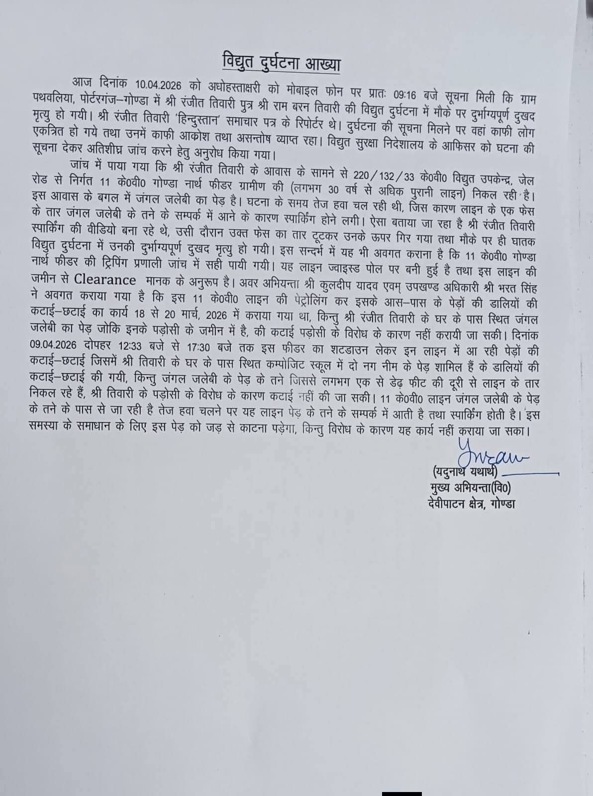 गोंडा : जनपद गोंडा अंतर्गत पोर्टरगंज पथवलिया में शुक्रवार सुबह एक दर्दनाक हादसे ने पूरे इलाके को झकझोर कर रख दिया, जहां बिजली विभाग की कथित लापरवाही के चलते घर के ऊपर से गुजर रही हाईटेंशन लाइन अचानक टूटकर गिर गई और उसकी चपेट में आने से वरिष्ठ पत्रकार रंजीत तिवारी की मौके पर ही मृत्यु हो गई। घटना के बाद क्षेत्र में हड़कंप मच गया और परिजनों में कोहराम मच गया। प्राप्त जानकारी के अनुसार सुबह करीब 9 बजे तेज हवा के दौरान लाइन में स्पार्किंग हो रही थी, उसी दौरान तार टूटकर नीचे गिर गया। प्रत्यक्षदर्शियों और परिजनों के अनुसार रंजीत तिवारी अपने घर के बाहर मौजूद थे और बच्चों को खतरे से दूर हटने के लिए कह रहे थे, तभी अचानक तार उनके ऊपर गिर पड़ा और करंट लगने से उनकी मौके पर ही मौत हो गई।