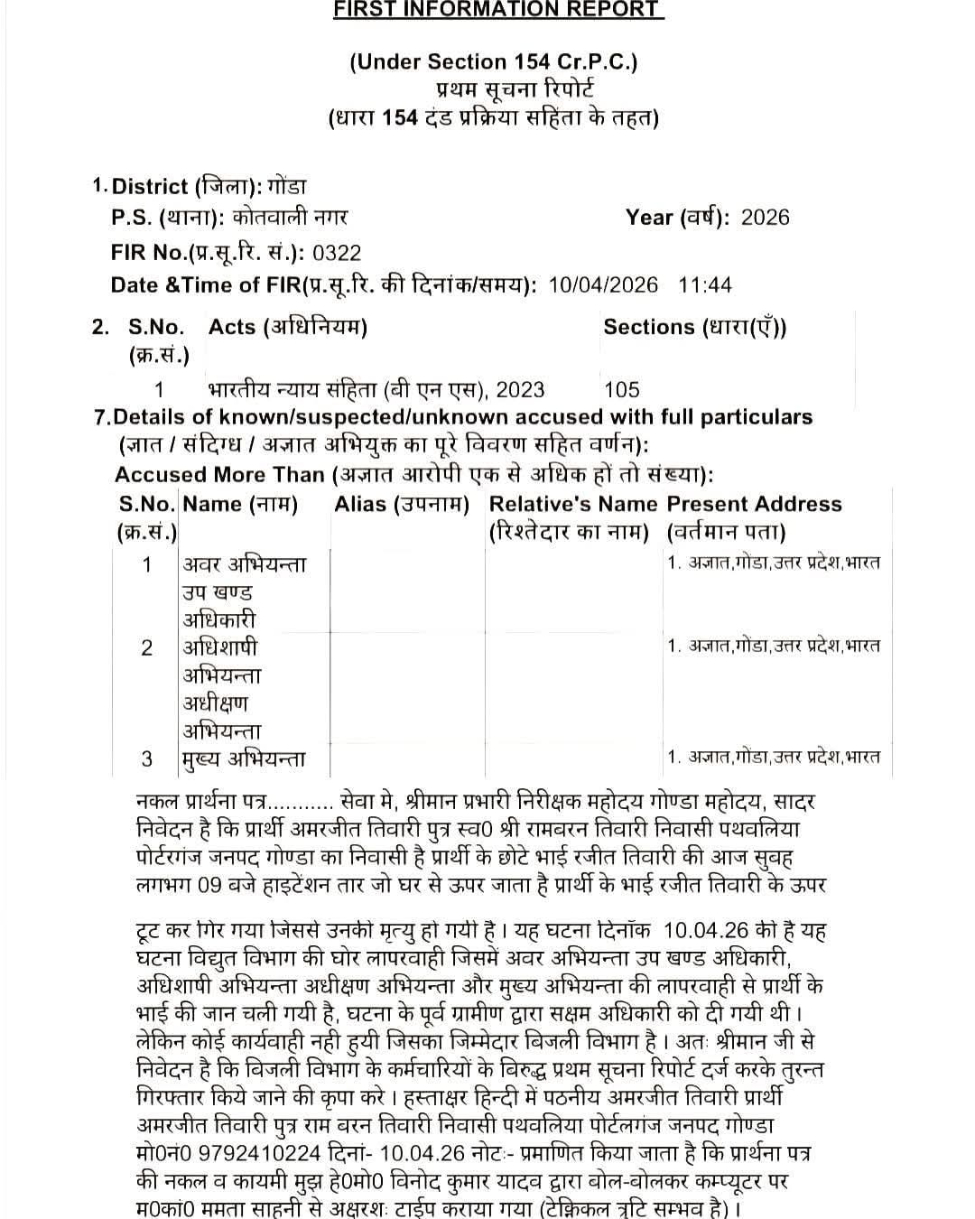 घटना के बाद सामने आई जांच रिपोर्टों ने पूरे मामले को और विवादित बना दिया है। एक ओर विभाग के अधिशासी अभियंता स्तर की रिपोर्ट में यह उल्लेख किया गया है कि रंजीत तिवारी अपने घर से निकलकर काम पर जा रहे थे, उसी दौरान तेज हवा के कारण लाइन के पास लगे पेड़ की डालियां तार से टकराईं, जिससे लाइन टूटकर उनके ऊपर गिर गई और यह हादसा हो गया। इस रिपोर्ट में इसे प्राकृतिक कारणों और परिस्थितिजन्य दुर्घटना बताया गया है। वहीं दूसरी ओर मुख्य अभियंता स्तर की जांच आख्या में अलग ही तथ्य सामने रखे गए हैं। इस रिपोर्ट के अनुसार घटना के समय रंजीत तिवारी मौके पर खड़े होकर वीडियो बना रहे थे और उसी दौरान लाइन में आई खराबी के चलते तार टूटकर उनके ऊपर गिर गया। साथ ही रिपोर्ट में यह भी कहा गया है कि लाइन के पास पेड़ों की डालियां और तेज हवा इस दुर्घटना के प्रमुख कारण रहे, जबकि लाइन की ट्रिपिंग व्यवस्था को सही बताया गया है। एक ही विभाग के दो अधिकारियों की इन विरोधाभासी रिपोर्टों ने पूरे मामले की निष्पक्षता और सच्चाई पर गंभीर सवाल खड़े कर दिए हैं। परिजनों और स्थानीय लोगों का आरोप है कि सच्चाई को छिपाने और जिम्मेदारी से बचने के लिए अलग-अलग तरीके से घटना को पेश किया जा रहा है। लोगों का कहना है कि पिछले करीब 10 वर्षों से इस हाईटेंशन लाइन को हटाने या शिफ्ट करने की मांग की जा रही थी, लेकिन विभाग ने कोई ठोस कदम नहीं उठाया, जिसके चलते यह हादसा हुआ। घटना के बाद मृतक के परिजनों और स्थानीय नागरिकों में भारी आक्रोश है। लोगों ने दोषी अधिकारियों के खिलाफ सख्त कार्रवाई की मांग की है और यह भी आरोप लगाया है कि लाइन शिफ्टिंग के लिए धनराशि स्वीकृत होने के बावजूद कार्य नहीं कराया गया। मामले की गंभीरता को देखते हुए जिलाधिकारी ने उच्च स्तरीय जांच टीम गठित कर दी है और दोषियों के खिलाफ कड़ी कार्रवाई का आश्वासन दिया गया है। इस घटना के संबंध में थाना कोतवाली नगर में एफआईआर संख्या 0322/2026 दर्ज की गई है, जिसमें बिजली विभाग के जेई, एसडीओ, एक्सईएन, एसई और चीफ इंजीनियर को नामजद करते हुए गैर इरादतन हत्या के तहत मामला दर्ज कर जांच शुरू कर दी गई है। यह पूरा मामला अब एक बड़े सवाल के रूप में सामने है कि आखिर सच्चाई क्या है और किसे बचाने के लिए अलग-अलग रिपोर्ट तैयार की जा रही हैं। जब एक ही विभाग के अधिकारी एक ही घटना पर अलग-अलग बयान दे रहे हैं, तो निष्पक्ष जांच और न्याय की उम्मीद और भी महत्वपूर्ण हो जाती है।