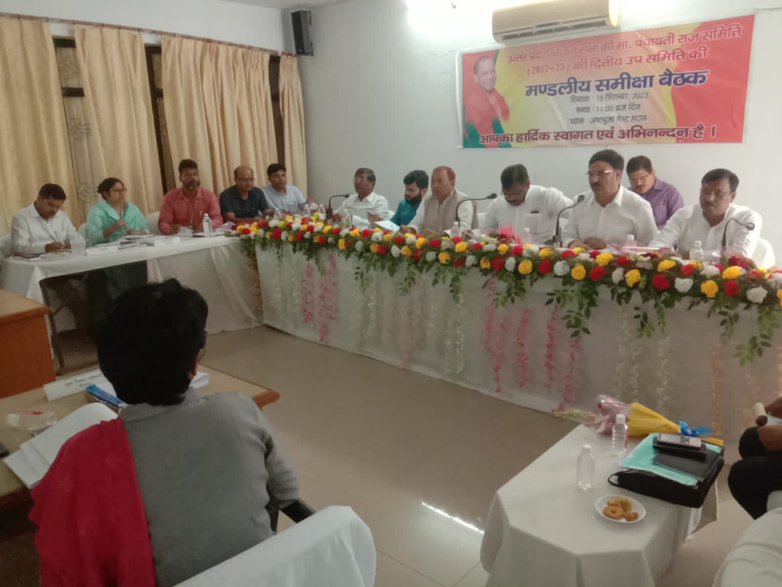 मीरजापुर 15 सितम्बर 2023- उत्तर प्रदेश विधानसभा की मा0 पंचायतीराज समिति की द्वितीय उप समिति के मा0 सभापति व मा0 सदस्यगण के द्वारा आज अष्टभुजा निरीक्षण गृह में जनपद मीरजापुर व भदोही के जिलाधिकारी, मुख्य विकास अधिकारी व अन्य सम्बन्धित अधिकारियों के साथ बैठक कर केन्द्र एवं राज्य सरकार द्वारा पंचायती राज विभाग तथा ग्राम्य विकास विभाग के ग्रामीणो क्षेत्रो एवं परिषदो के द्वारा विकास हेतु चलायी जा रही योजनाओं तथा केन्द्रीय प्रायोजित ग्रामीण स्वच्छता कार्यक्रम के अन्तर्गत विभिन्न गतिविधियों के प्रगति की समीक्षा की गयी।