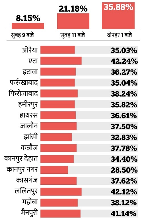 उत्तर प्रदेश में थर्ड फेज की वोटिंग जारी है। 16 जिलों की 59 सीटों पर दोपहर एक बजे तक 35.88% वोट डाले गए हैं। शुरुआती घंटों में वोटर्स का जोश हाई रहा। बुजुर्ग और दिव्यांग भी अपने वोट के अधिकार का इस्तेमाल करने पहुंचे। दुल्हनें भी बूथ पर दिखीं, जो विदा होने से पहले वोट डालने आईं। मुलायम सिंह व्हील चेयर पर वोट डालने आए। मुलायम के भाई 78 साल के अभय राम बाइक से वोट डालने पहुंचे। अखिलेश और डिंपल ने पूरी फैमिली के साथ सैफई में वोट डाला।